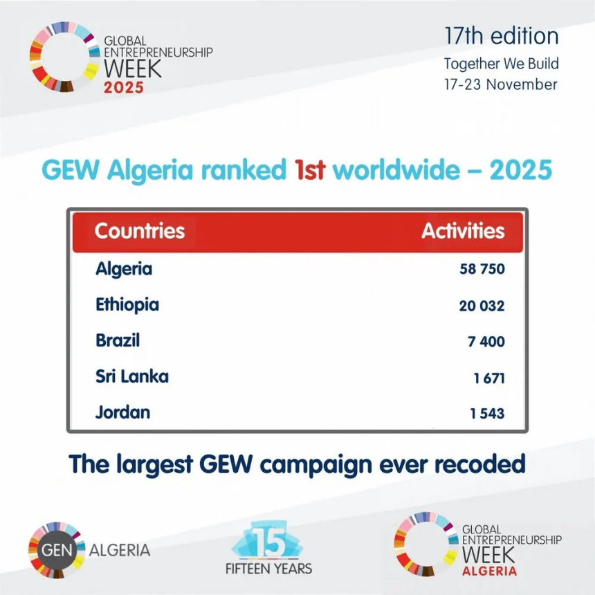 Selon les chiffres du Réseau, organisateur de cette manifestation internationale, la 17e édition, tenue du 17 au 23 novembre 2025, a vu l’organisation de 58750 activités en Algérie, qui arrive en tête du classement mondial, suivie de l’Ethiopie (20032 activités) et du Brésil (7400 activités).