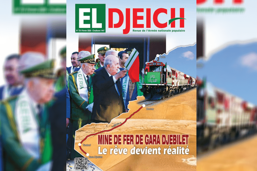 Héritière légitime de l’Armée de libération nationale, elle continue, souligne la revue, de s’acquitter avec mérite et détermination de ses nobles missions constitutionnelles. L’ANP accompagne le processus de développement national à travers sa contribution active aux projets structurants, tout en assumant pleinement sa mission fondamentale de protection du territoire national. Elle veille, sans relâche, à la sécurisation de chaque parcelle de la patrie face à toute tentative d’atteinte à la sécurité, à la stabilité et à la quiétude du peuple algérien, renforçant ainsi l’immunité du pays et la sérénité de la société. El Djeïch rappelle que le mois de février est marqué par une réalisation historique d’envergure, symbolisant concrètement la montée en puissance de l’Algérie souveraine. Il s’agit du lancement officiel, par le président de la République, M. Abdelmadjid Tebboune, chef suprême des Forces armées et ministre de la Défense nationale, de l’exploitation de la ligne minière ferroviaire reliant le gisement stratégique de Gara Djebilet à Tindouf et Béchar sur une distance de 950 kilomètres.